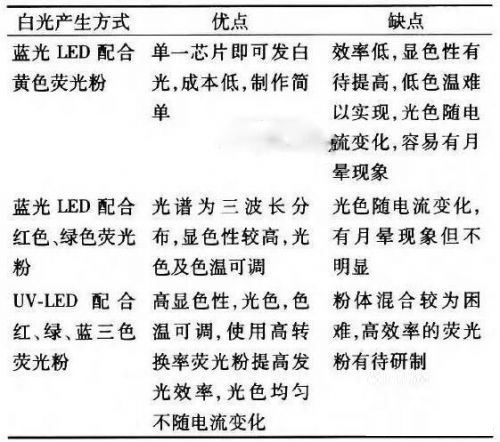 目前采用熒光粉產(chǎn)生白光共有三種方式:藍(lán)光LED配合黃色熒光粉;藍(lán)光LED配合紅色、綠色熒光粉;UV-LED配合紅、綠、藍(lán)三色熒光粉。其中商品化的 白光LED多屬藍(lán)光LED配合黃色熒光粉的單芯片型,藍(lán)光LED配合紅色、綠色熒光粉的白光產(chǎn)生方式只是在OSRAM、Lumileds等公司的專利上報(bào) 道過,但仍未有商品化產(chǎn)品出現(xiàn),而UV-LED配合三色熒光粉的方式目前也尚處于開發(fā)中。不同熒光粉產(chǎn)生白光LED的優(yōu)缺點(diǎn)比較見下表。
