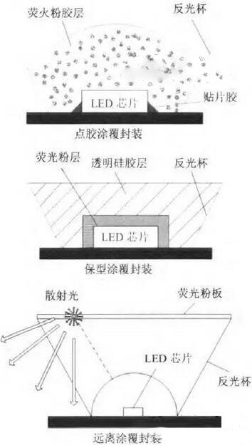光轉(zhuǎn)化結(jié)構(gòu),即熒光粉涂層結(jié)構(gòu),主要面向LED白光照明技術(shù),目的是為將LED芯片發(fā)出的波長較短的光線轉(zhuǎn)化為與之互補(bǔ)(顏色互補(bǔ)形成白光)的波長較長的光線。