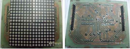把顯示屏電路和顯示屏驅(qū)動電路分別做在兩塊電路板上,顯示屏電路的行掃描信號輸出管腳和列顯示信號數(shù)據(jù)輸出管腳分別引用兩排16針的排針引出,排針長的那一頭接到電路板的底層,以方便插入驅(qū)動電路的插槽中。同樣在驅(qū)動電路用兩排16腳的插槽將行掃描信號輸出管腳和列顯示信號數(shù)據(jù)輸出管腳引出,在畫PCB時應(yīng)當注意屏電路PCB中兩排排針之間的距離要與驅(qū)動電路PCB中兩排插槽之間的距離一樣,才能保證能正確地將顯示屏電路板排到驅(qū)動電路電路板上方。以下為該電路的實物圖與PCB。