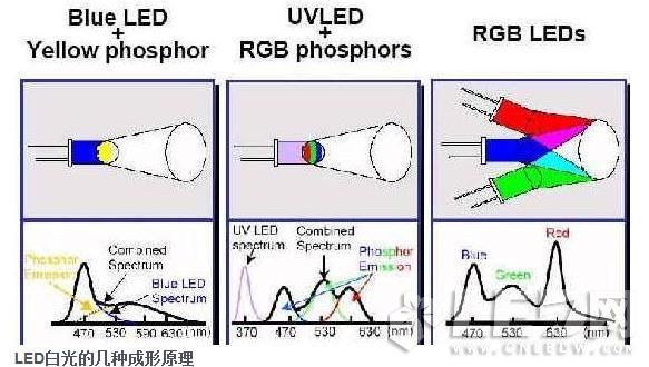 RGB燈的成像原理:RGB燈是以三原色共同交集成像,此外,也有藍光LED配合黃色熒光粉,以及紫外LED配合RGB熒光粉,整體來說,這兩種都有其成像原理,但是衰減問題與紫外線對人體影響,都是短期內(nèi)比較難解決的問題,因此雖然都可以達 到白光的需求,卻有不同的結(jié)果。