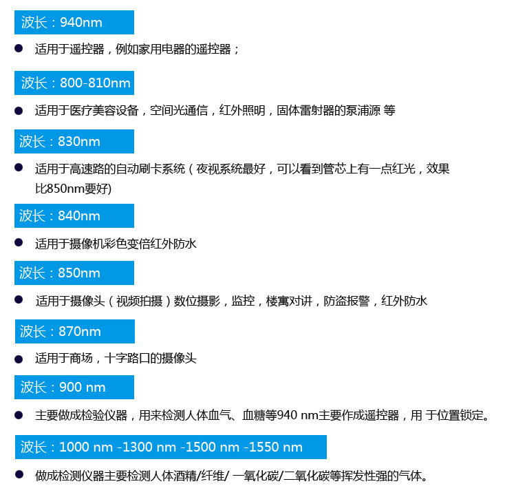 深圳市極光光電有限公司,專業(yè)研發(fā)生產(chǎn)高清紅外LED燈(如850/940紅外發(fā)射燈,超高亮紅,黃,藍,綠,紅黃藍綠白交通信號,貼片0603,0805,3528,2835,50503020大功率紅外LED燈,5050紅外線發(fā)射管。主要用于;游戲機、投幣機、遙控器、各種安防設(shè)備、紅外線像頭、電子儀表,電表,水表,鼠標,鍵盤,高清網(wǎng)絡(luò)攝像頭,車載后視,紅外車載攝像頭,交通信號燈紅外攝像頭,醫(yī)療保健設(shè)備.紅外相機,無線鼠標遙控機,室內(nèi)照明,景觀燈飾,背光源,廣告與標志……廣泛應(yīng)用于樓宇對講、安防監(jiān)控、錄音筆、車載DVDV、筆記本電腦、醫(yī)療設(shè)備、手機、電話機、耳機、對講機、收錄機、聲控?zé)艏奥暱赝婢叩?。本司長期供應(yīng)850紅外燈正品,正芯,各角度型號正常供應(yīng)8mm圓頭紅外發(fā)射管型號:IRP8013C2無色膠體(也可做有色膠體IRP8013T2,藍色膠體,IRP8013F2,黑色膠體)波長:940-950nm,840-850nm發(fā)射距離:8-15米,15-20米,30-100米以上工作電壓:940電壓為1.1-1.3V850電壓為1.45-1.55V工作電流:按照芯片大小決定10mil芯片為30毫安12mil為50毫安14mil為80毫安16mil為100毫安40mil芯片為300毫安42mil芯片為800毫安發(fā)射角度:15°、30°、45°、60°90°120°140°度適用于小家電,開關(guān),電動牙刷,玩具,醫(yī)療器械,遙控器和夜間監(jiān)控器(攝像頭)特性:體積小,光度強適合在室內(nèi)外及高溫度與低溫度下工作。